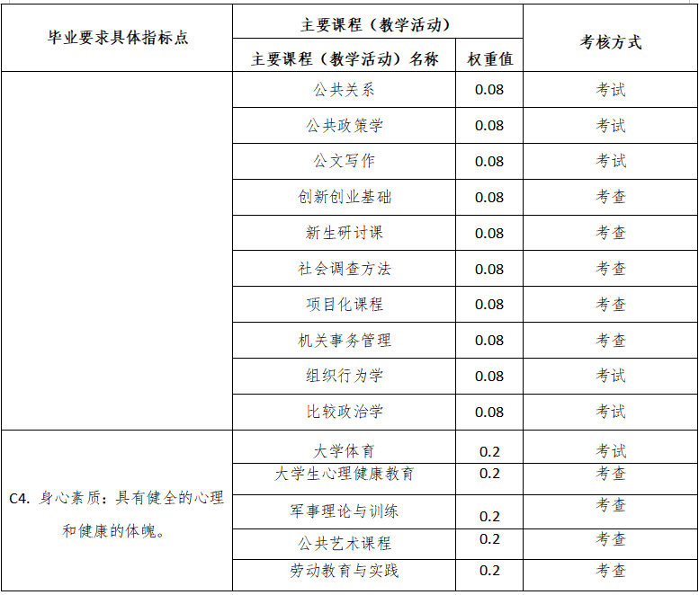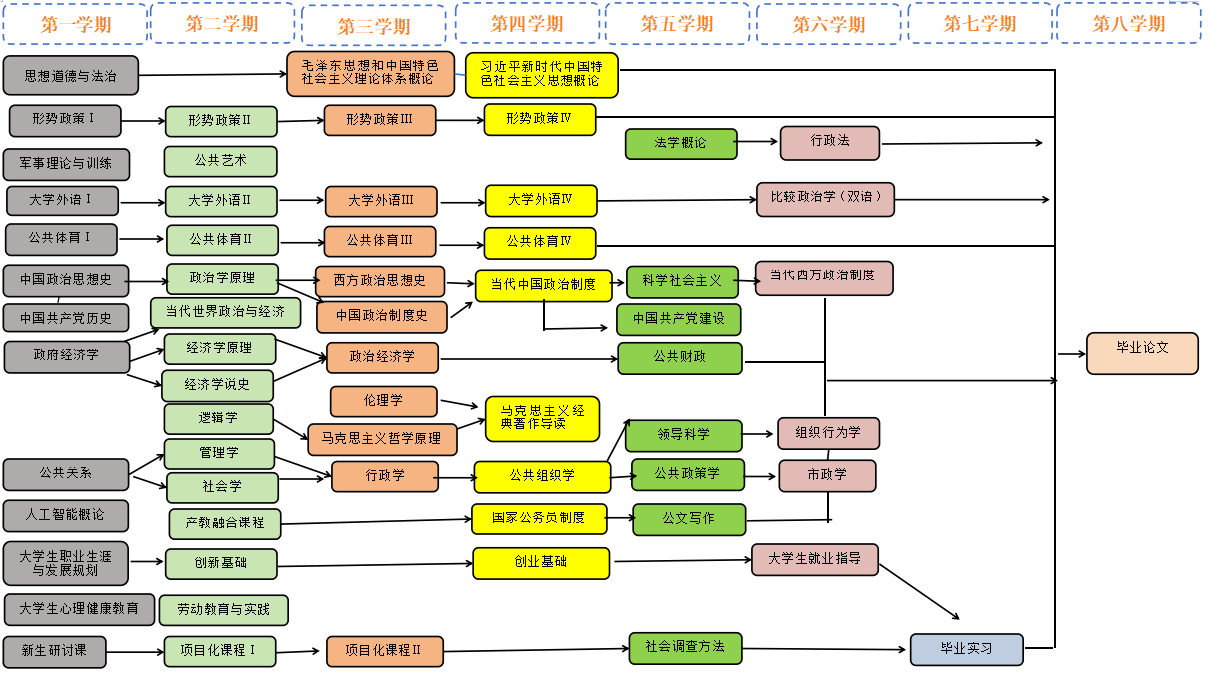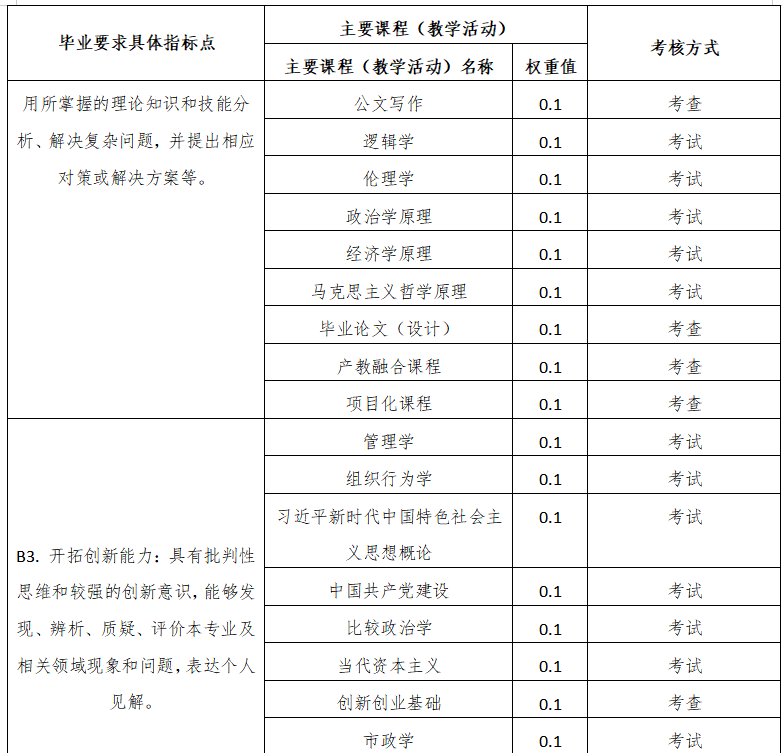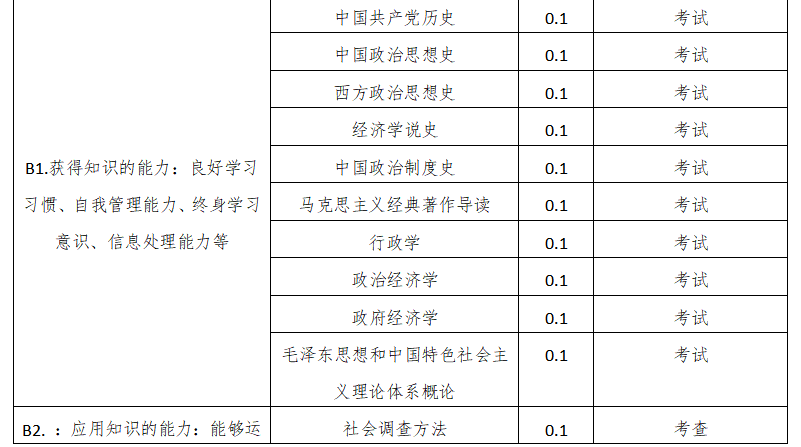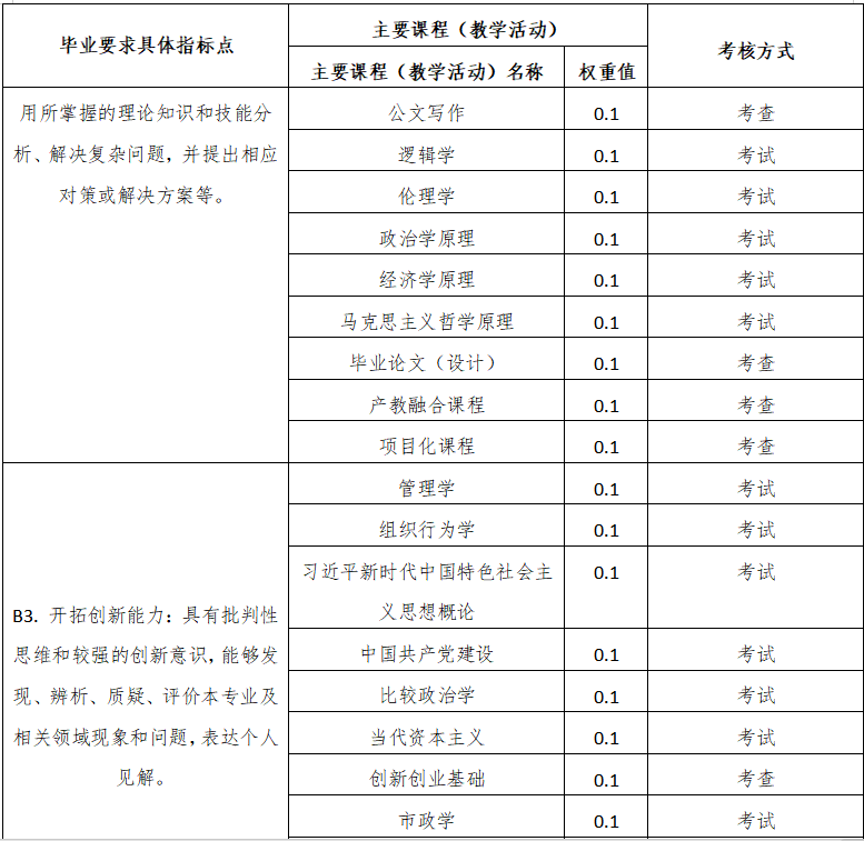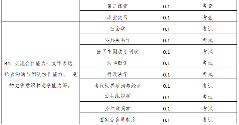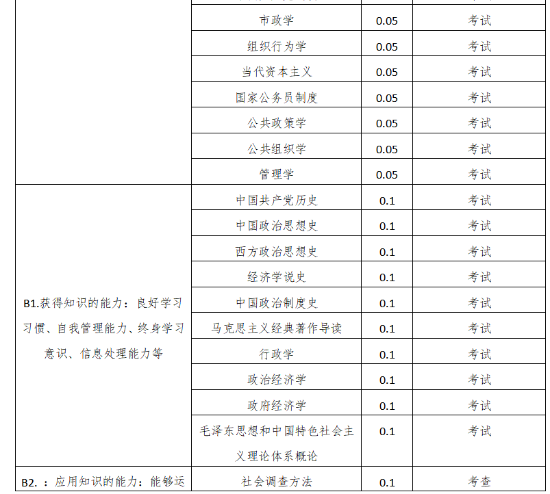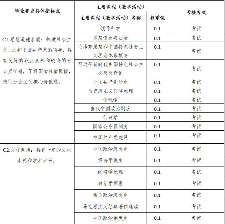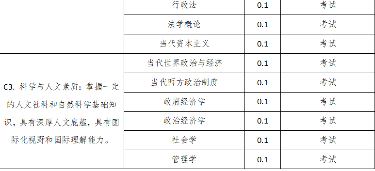 2)专业教育课程:包括专业必修课程、专业选修(方向)课程与专业任选课。其中,专业必修课程包括学科基础课与专业核心课,主要有“政治学原理、中国共产党历史、马克思主义哲学原理、中国政治思想史、经济学原理、经济学说史、社会学、中国政治制度史、行政学、公共组织学、政治经济学、政府经济学、逻辑学、马克思主义哲学原著导读、当代中国政治制度、西方政治思想史、当代世界政治与经济、伦理学、公共关系学”。