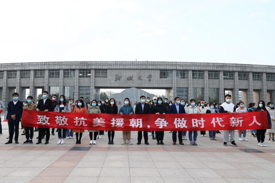 铭记伟大胜利,推进伟大事业。为了纪念中国人民志愿军抗美援朝出国作战70周年弘扬伟大抗美援朝精神10月25日清晨,555电影 于西校十一广场举行以“致敬抗美援朝·争做时代新人”为主题的团日活动。555电影 校团委书记宗传军,副书记曹娜娜、李鹏,校团委组织部部长乔华军,校团委志工部副部长孟宁应邀出席。555电影 辅导员徐娜、于进、程德香、朱晓涵以及全体学生党员、积极分子、学生代表等二百余人参加了此次活动。