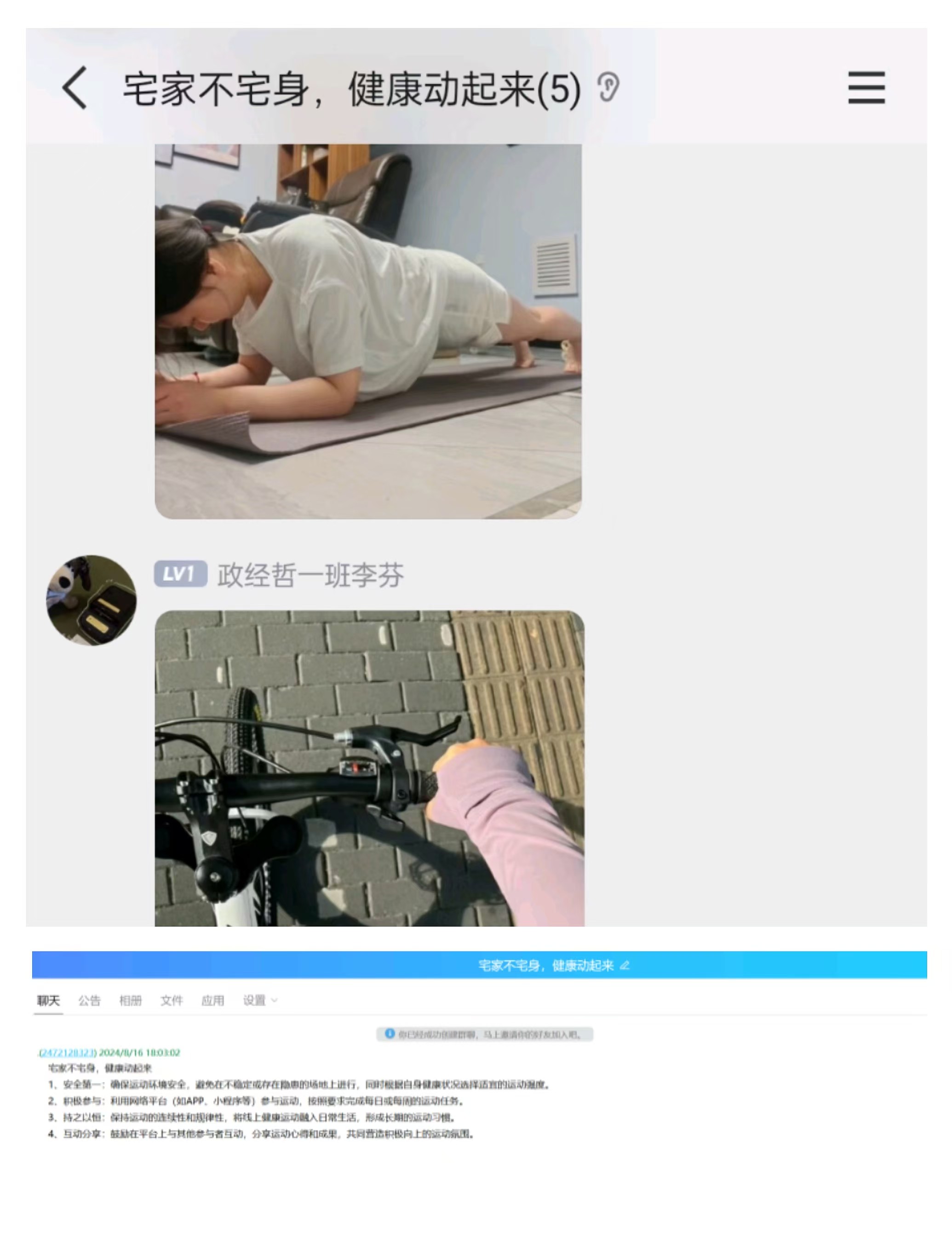 活动负责人向参与者介绍,本次的活动主题为打破传统“宅”文化中带来的久坐不动、缺乏锻炼的生活方式,引导参与者在暑期形成健康的运动、生活方式。活动期间,参与者们围绕主题拍摄照片、短视频等,展示参与者在暑期的健身训练、饮食计划、训练方案等内容,分享参与者认为最健康的健身运动方式。参与活动的学生们纷纷发挥创意,将家中客厅、阳台甚至卧室改造成临时的“健身房”,还有的学生创新性地开发了家庭版有氧运动课程,如跳绳、开合跳、原地跑等。其中,赵子豪分享他的健康饮食,懒人健康运动。为增强活动的互动性和趣味性,在线上交流平台中,参与者在这里分享自己的运动心得、成果照片和视频,相互鼓励、相互学习。活动结尾,负责人指出运动是增强学生身体素质的有效途径之一,希望参与者能够积极投身于体育锻炼,提高自己的身体素质,让自己拥有健康的身体。参与者尚姿璇表示:“参加此次活动需要大学生在无人监督的情况下,自觉地进行体育锻炼。这种自我驱动的运动习惯有助于培养我们的自律性和坚持精神,同时预防亚健康。”