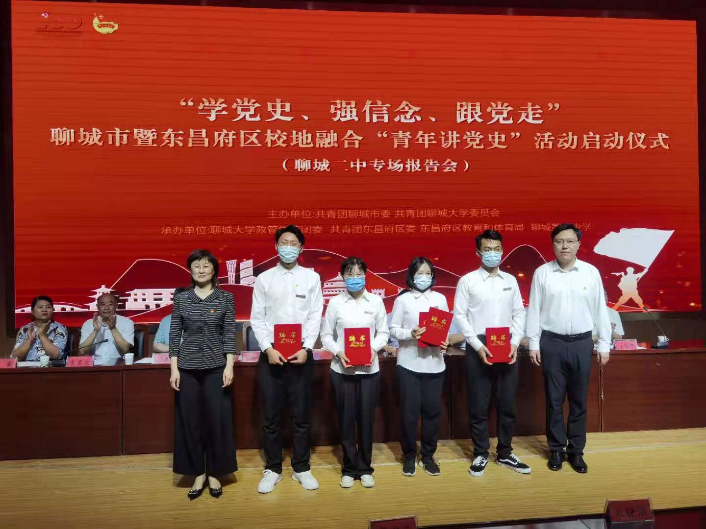 6月2日,“学党史、强信念、跟党走”聊城市暨东昌府校地融合“青年讲党史”宣讲活动启动仪式在聊城二中求索报告厅举办。团市委副书记付亮、555电影 团委副书记李鹏、555电影 党总支副书记副院长明辉、东昌府区委常委、宣传部长陈海蓉出席了活动,555电影 习近平新时代中国特色社会主义思想青年讲师团指导教师朱晓涵及青年学生讲师代表李宣志、荣小语、杨术访、张登龙到场参加活动。