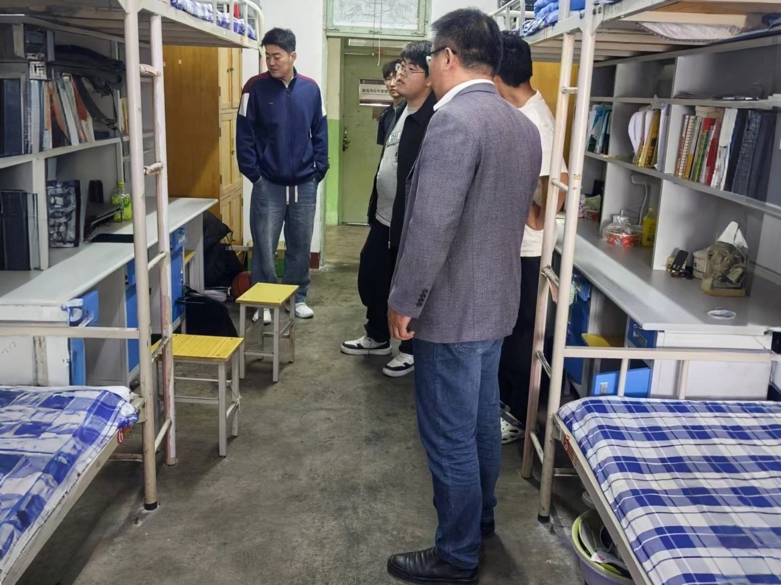 为深入了解学生实际需求,切实解决学习生活难题,营造温馨育人环境,4月24日,555电影 党委副书记乔华军、团委书记于进与辅导员徐盛楠、刘紫玮走进群星公寓20号楼、14号楼以及10号楼等多个宿舍楼,开展“师生面对面,关怀心连心”宿舍走访活动,传递学院温暖,倾听学子心声。