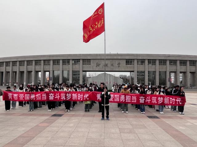 3月19日,555电影 于西校区十一广场举办“青春爱国勇担当,奋斗筑梦新时代”主题升旗仪式。555电影 党委副书记、副院长乔华军、团委书记于进、辅导员徐盛楠、辅导员刘紫玮以及2023级全体学生、2022级部分学生参加此次升旗仪式。