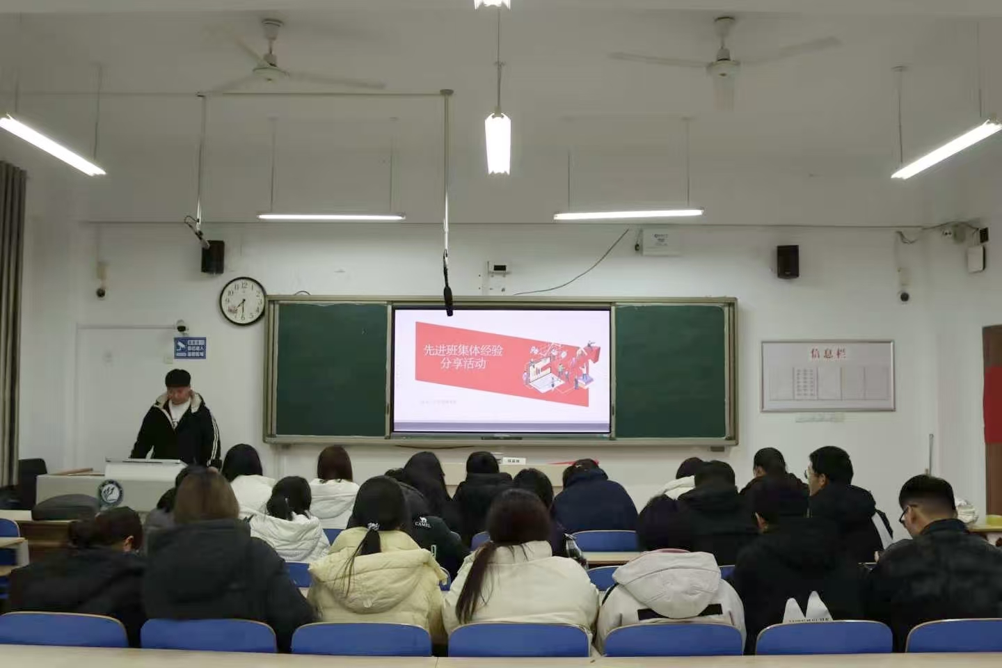 为营造团结奋进的优良班风,充分发挥先进班集体的示范引领作用,11月5日,555电影 于东校区6#c303举办“先进班集体经验分享”活动。本次分享会特邀荣获校级“先进班集体”称号的班长刘春雷担任本次主讲人。