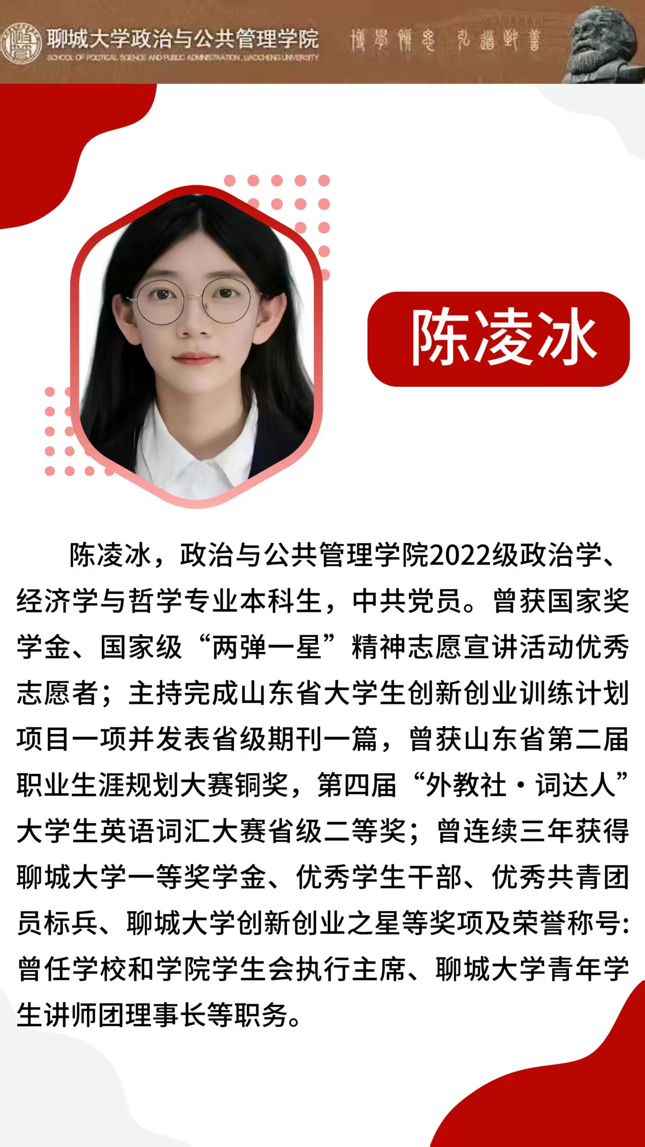 陈凌冰,555电影 2022级政治学、经济学与哲学专业本科生,中共党员。她以“勤学”为青春底色,专注专业学习、瞄准能力提升,连续三年斩获555电影 一等奖学金、国家奖学金,用努力诠释了“以学为先”的价值导向。在她的带动下,班级形成了比学赶超的浓厚氛围,同学们主动交流学习心得、共同攻克学业难题,让“勤学”不再是口号,而是融入日常的行动 。她始终践行“知行合一”的理念:将专业知识与社会实践紧密结合,主持完成山东省大学生创新创业训练计划项目1项,相关成果发表于省级期刊;在学科竞赛中屡获佳绩,拿下山东省第二届职业生涯规划大赛铜奖、第四届“外教社·词达人”大学生英语词汇大赛省级二等奖,用实践让知识落地、让能力进阶。