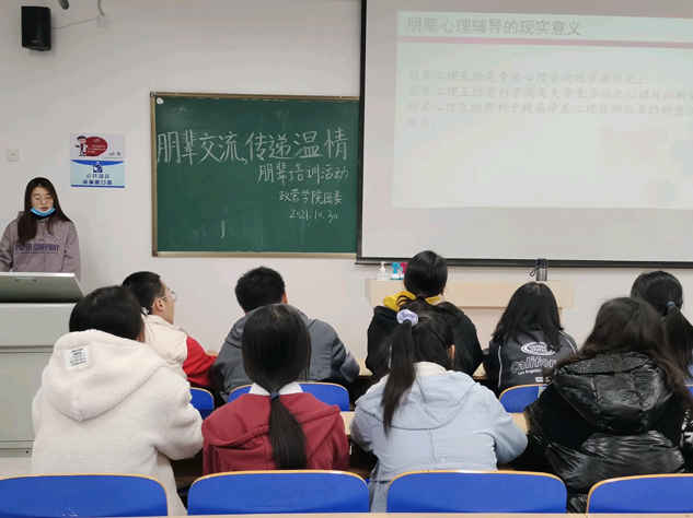 为使2021级大学生朋辈心理辅导员了解心理工作内容,加强555电影 朋辈心理辅导员的队伍建设,落实学院的各项心理工作,10月30日,555电影 于东校区6#A203举办“朋辈交流,传递温情”朋辈交流培训活动。