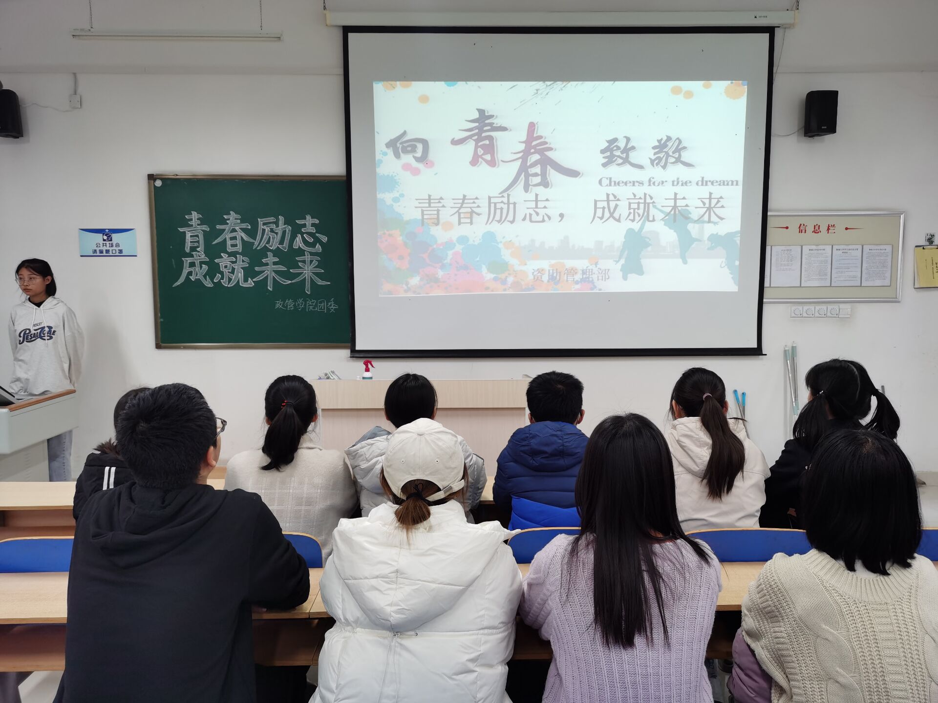 逐梦青春,不负韶华。活动总体分为PPT、视频讲解和青春励志个人演讲三部分。主持人通过对视频的精彩解说,让同学们心中燃起熊熊激情之火,现场气氛高涨。同学们依次上台进行励志演讲并分享了自己对青春的理解和期待。参赛者唐正文同学以高昂的激情抒发了自己在青春路途中奋勇前行的情感,走过青春渐渐成熟,在经历世事后保持内心的坚定和纯真,从未丢失自我;谷成红同学以董明珠女士为例,激励大家脚踏实地、敢想敢为、怀揣梦想,用年轻人的执着和追求把严谨细致落实到学业中的每一个小细节中来;高越同学通过摘抄优美诗句,将此次活动的中心主题——青春励志展现得淋漓尽致,在场的同学们也纷纷表示出努力奋斗的决心,表明要在今后的学习生活中不断充实自我,不负青春,砥砺前行。