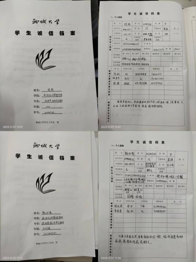 此次学生诚信档案的建立主要包括三个方面的内容:诚信档案内容的确立,学生各类资料的获得、分析以及对学生的信用评估。负责人为每一名同学发放诚信档案表使其自主填写相关信息,学校留作存档,并采集汇总了电子版,记录学生在大学生活的诚信信息。诚信档案主要包括学习是否诚信、经济是否诚信、生活品行是否诚信以及大学生个人承诺书。诚信档案反映了诚信主体在社会生活的各方面诚实守信程度的历史记录,涵盖经济领域的信用程度记录、道德品质减实状况和政治思想文明情况,并在学生思想政治工作和管理工作中发挥重要作用。学生在建立档案的第一时间承诺、签字。