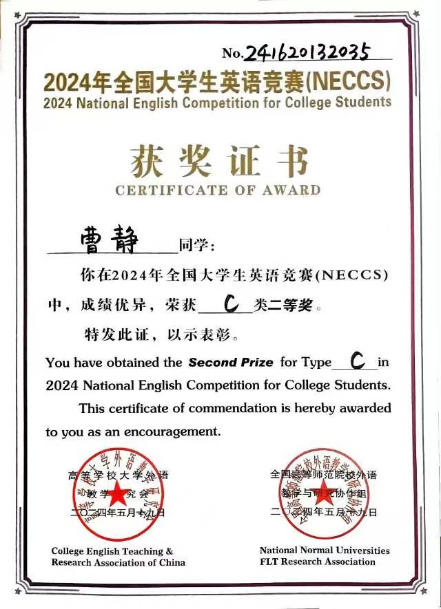 【资助育人取得实效】曹静在“全国大学生英语竞赛”中荣获二等奖