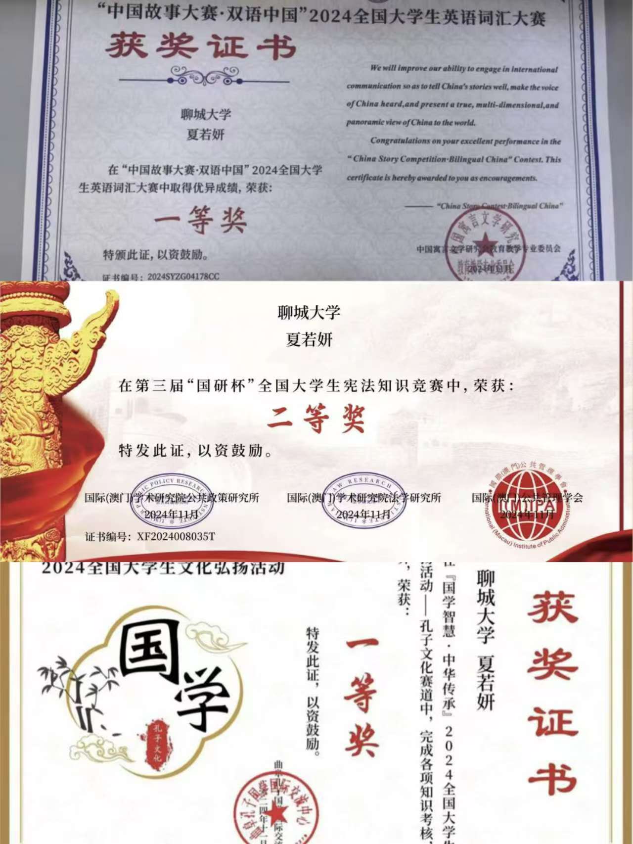 在2024全国大学生文化弘扬活动中,夏若妍凭借对传统文化的深刻理解与独特见解,一路过关斩将,最终荣获一等奖。她在比赛中深入挖掘文化内涵,通过精彩的展示与解读,让古老的文化在新时代绽放出新的光彩。同样在2024 全国大学生英语词汇大赛上,夏若妍也表现出色。面对海量的词汇挑战,她沉着冷静,凭借扎实的英语基础和高效的记忆方法,在赛场上挥洒自如,斩获一等奖。这一成绩不仅体现了其个人在英语学习上的努力与坚持,也彰显了我校在英语教学方面的卓越成效。而在第三届国研杯全国大学生宪法知识竞赛中,她再次证明了自己的实力。宪法知识专业性强、涉及面广,但她充分利用课余时间深入学习研究,在竞赛中精准作答,以出色的表现荣获二等奖。其成功并非偶然。据了解,她在日常学习中就勤奋刻苦,对各类知识都有着浓厚的兴趣和强烈的求知欲。无论是图书馆的浩瀚书海,还是校园里的学术讲座,都能看到她忙碌而专注的身影。