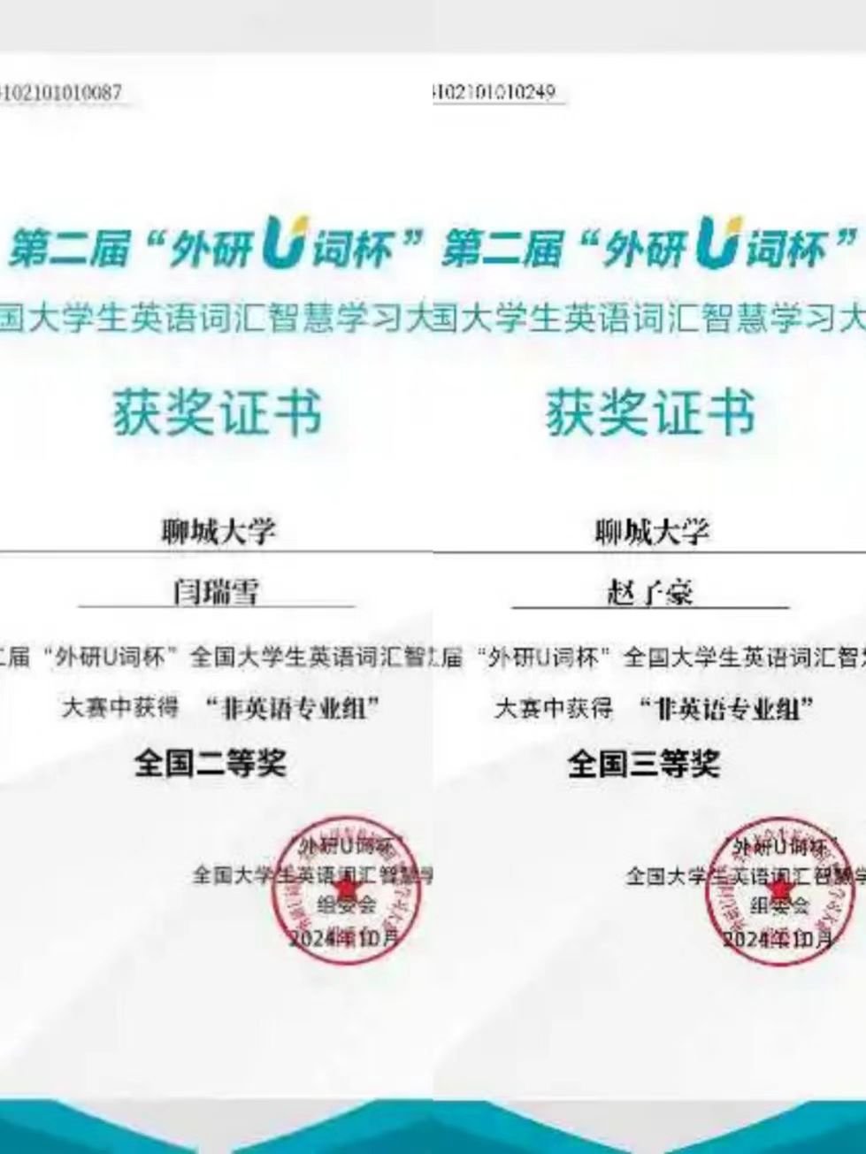 【资助育人取得成效】闫瑞雪、赵子豪在外研U词杯比赛中荣获二、三等奖