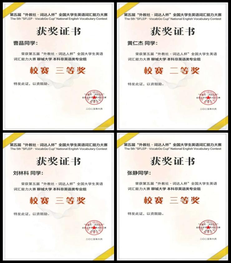 学院依托各类学科竞赛平台,鼓励受助学生积极参与,为他们搭建提升自我、展示才华的舞台,让资助政策真正成为助力学子成长成才的“助推器”。第五届“外教社·词达人杯”全国大学生英语词汇能力大赛本科非英语类专业组校赛结果揭晓。在激烈的角逐中,555电影 黄仁杰、曹晶、刘林科、张静等同学分别荣获二等奖、三等奖。他们的脱颖而出,不仅收获了荣誉,更锤炼了迎难而上、奋勇争先的拼搏精神。