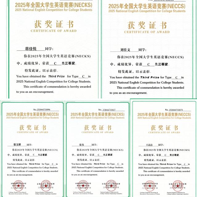近年来,555电影 的资助育人工作一直坚持“扶困”与“扶智”并行:一方面严格落实助学金、奖学金等资助政策,切实解决学生的经济压力;另一方面通过开设学业辅导班、提供一对一心理疏导、搭建实践交流平台等方式,为受助学生扫清学习和成长路上的障碍,拓宽他们的发展路径。这些实实在在的帮扶举措,让受助学生的潜力得到了充分释放,他们在各类赛事和实践活动中屡创佳绩。在2025年全国大学生英语竞赛中,555电影 王高洁、张伟、张玉妍、刘佳文、蒋佳悦五位受助学子,凭借平日里的刻苦积累和扎实的英语功底,全部斩获C类三等奖。这份成绩,既是五位同学日夜努力的结果,也直观印证了555电影 资助育人工作的实际效果。