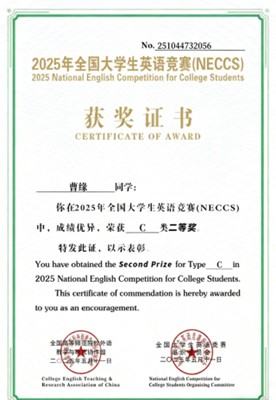 【资助育人取得实效】曹缘在全国大学生英语竞赛中荣获二等奖