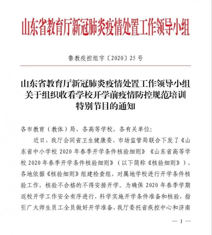 山东省教育厅新冠肺炎疫情处置工作领导小组关于组织收看学校开学前疫情防控规范培训特别节目的通知