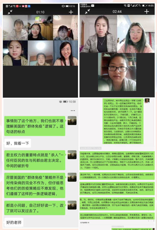 哲学系赵磊老师就“人工智能与国家重大疫情防控”问题与学生展开讨论,分析了在疫情防控中人工智能的多重应用场景,并提出要主攻关键核心技术、完善法治保障、加强国际交流合作等措施;刘晋老师讨论组就“重大疫情下逆行者的美学分析”展开研讨,从中国古典美学、马克思主义美学、现代西方美学的视角分析“逆行者”美的行为及崇高精神价值;延玥老师讨论组结合中国哲学的“天人合一”思想,对新冠肺炎的发生与肆虐进行了讨论和反思,发掘“天人合一”思想的题中应有之义,并对其进行现代解读;王双彪老师就“突发疫情:生命的不确定性与宗教关怀”的问题与学生展开讨论,认为由于疫情造成的恐慌能够使人重新回到对自身的认识,并从宗教关怀、死亡观等方面结合目前疫情进行了分析。除此之外,谢玉亮老师讨论组就“新型肺炎疫情的现代性反思”进行讨论,丰琰老师讨论组就“重大疫情下公共责任意识的伦理学思考”展开研讨,田杰英老师讨论组就“重大疫情下义利关系的思考”展开分析,陈辉老师、李腾老师讨论组围绕“重大疫情下社会主义生态文明的建设进路”和“重大疫情引发的人本主义哲学反思”进行分析讨论。
