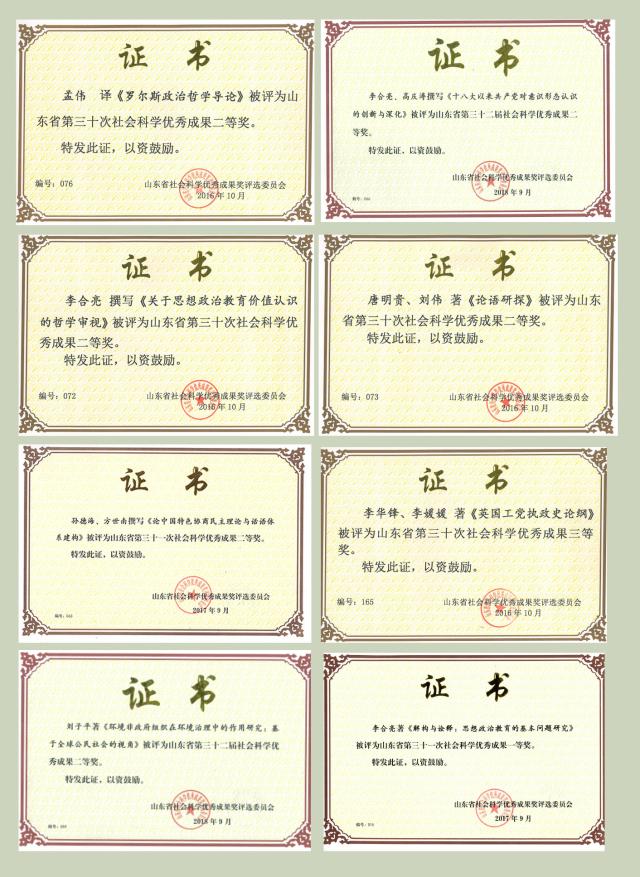 科学研究注重精耕细作,力求出精品力作,整体科研实力一直稳居全校前列。学院获批国家社科项目13项,包括重大项目子课题1项,重点项目1项,青年项目1项,后期资助项目1项,一般项目9项;高水平论文3篇,B类期刊2篇,C类期刊1篇;高水平著作10部;山东省社会科学优秀成果奖 10项,包括一等奖2项,二等奖6项,三等奖2项;山东省优秀硕士论文1篇;教育部首届教育硕士教学技能大赛二等奖1项;山东省研究生优秀教师1人;教育部第七届教育硕士优秀教师1人。