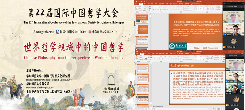第22届国际中国哲学大会“世界哲学视域中的中国哲学”(Chinese Philosophy from the Perspective of World Philosophy——The 22nd International Conference of the ISCP)在2022年6月27日至7月1日在中国上海召开。本次会议由国际中国哲学会、华东师范大学主办,华东师范大学中国现代思想文化研究所、华东师范大学哲学系承办,上海中西哲学与文化比较研究会协办。会议采取线上会议形式举办。