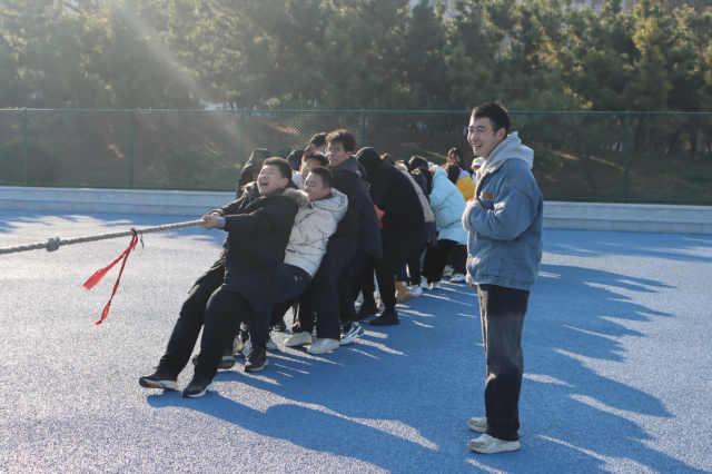 本次拔河比赛为两两对战,每次比赛分为三轮,胜场数量多的班级晋级,晋级后的班级再进行对决,留到最后的班级获得胜利。活动负责人张国庆宣布比赛规则,鼓励同学们积极参加体育运动,发扬拼搏精神。在充分的热身后,两边同学进行友好的问候,随着裁判的哨声响起,参赛同学们迅速展开激烈对抗,逐渐进入比赛状态。场上同学们挥汗如雨、锐意奋发,展现了顽强拼搏与积极进取的精神,场外观众不断呐喊助威,体现同学们对体育的热情,展现出积极向上、热爱运动的良好精神风貌。本次拔河比赛秉持公平公正原则,张国庆全程遵守严谨的原则对同学们进行评判,做到保持赛场的稳定秩序,营造良好的比赛氛围。本次拔河比赛,提高了同学们对体育的兴趣,也展现了同学们健身的新风尚。参赛同学郭冉表示,这次拔河比赛不仅能锻炼我们的身体,还能帮助我们放松身心、缓解压力,增进与同学之间的感情,通过这次活动,会有越来越多的同学加入体育锻炼。