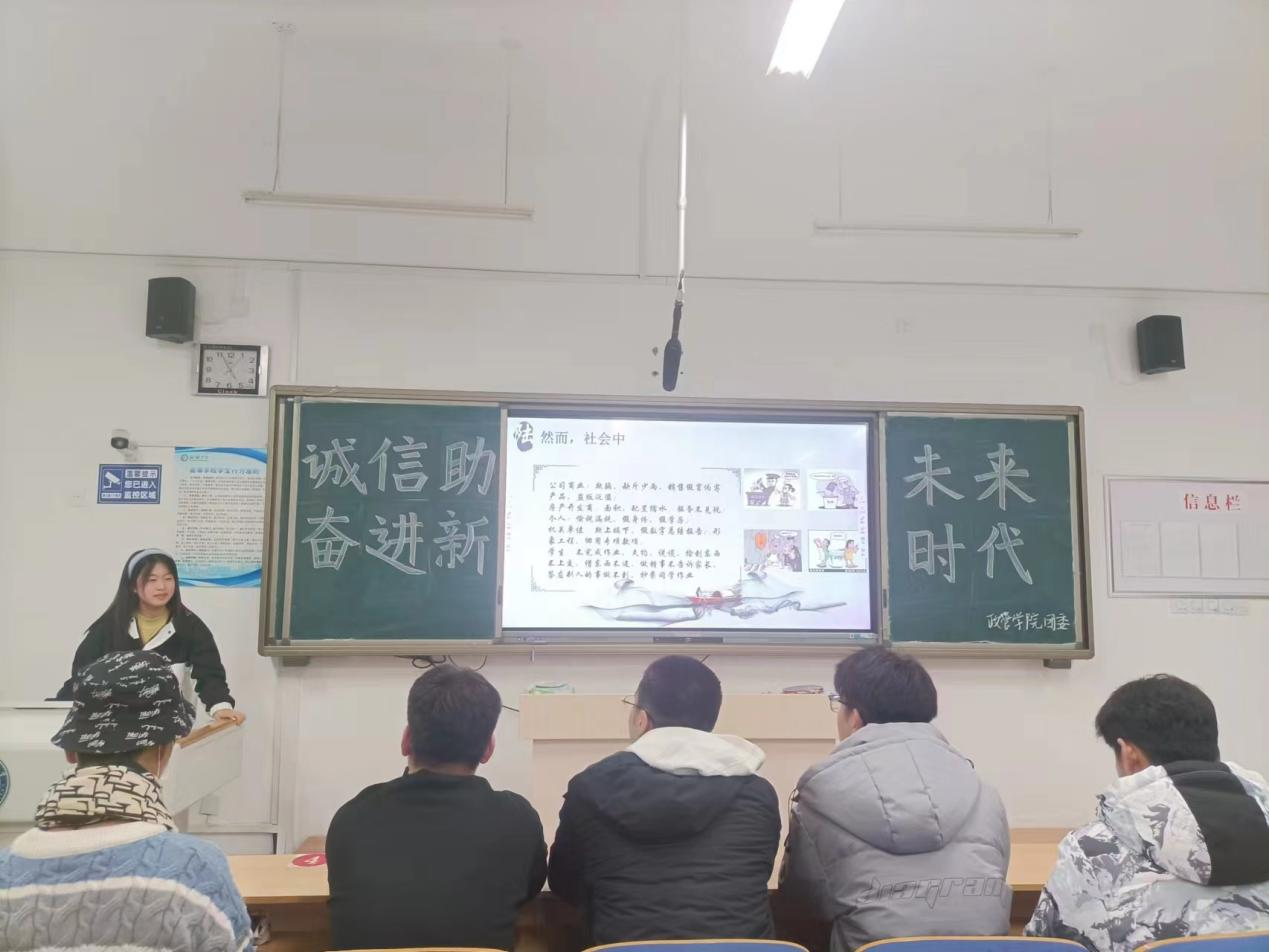 本次活动从什么是诚信,诚信的故事、诚信的格言、不诚信的表现以及如何践行诚信这五个方面展开。诚信,既是中华民族的传统美德,也是社会主义核心价值观个人层面的价值准则,更是塑造学生健康人格,实现人生价值的道德基石。活动主讲人王梦洁通过放映视频和讲述故事的形式,生动形象地为同学们讲述了诚信的重要性和不遵守诚信可能带来的严重后果和损失。每位同学都准备了一则诚信小故事和他们日常见过或者做过的一些不诚信的事并与大家分享、反思。随后同学们被分为两两一组,一位同学讲一则诚信故事,另一位同学猜故事代表的成语,用时最少的一组胜出。赵子豪同学列举了一些在日常生活、学习、待人接物上讲求诚信的例子,他表示,诚信是指诚实不欺,讲求信用,人与人之间应该真诚相待,言而有信,做到诚信需要我们勇于承担责任,实事求是。活动结尾,主讲人王梦洁带领同学们一起唱了八荣八耻诚信之歌,让同学们深刻理解诚信做人的含义。