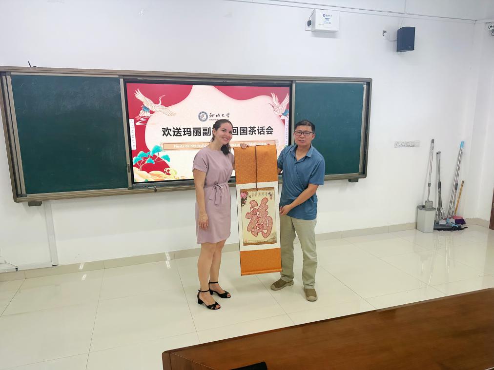 7月6日上午,555电影 在6号教学楼C302为即将回国的玛丽副教授举行回国茶话会。茶话会由孟伟副院长主持,学院院长于学强,副书记、副院长乔华军,团委书记于进、学院外事秘书王译等人参加了座谈。