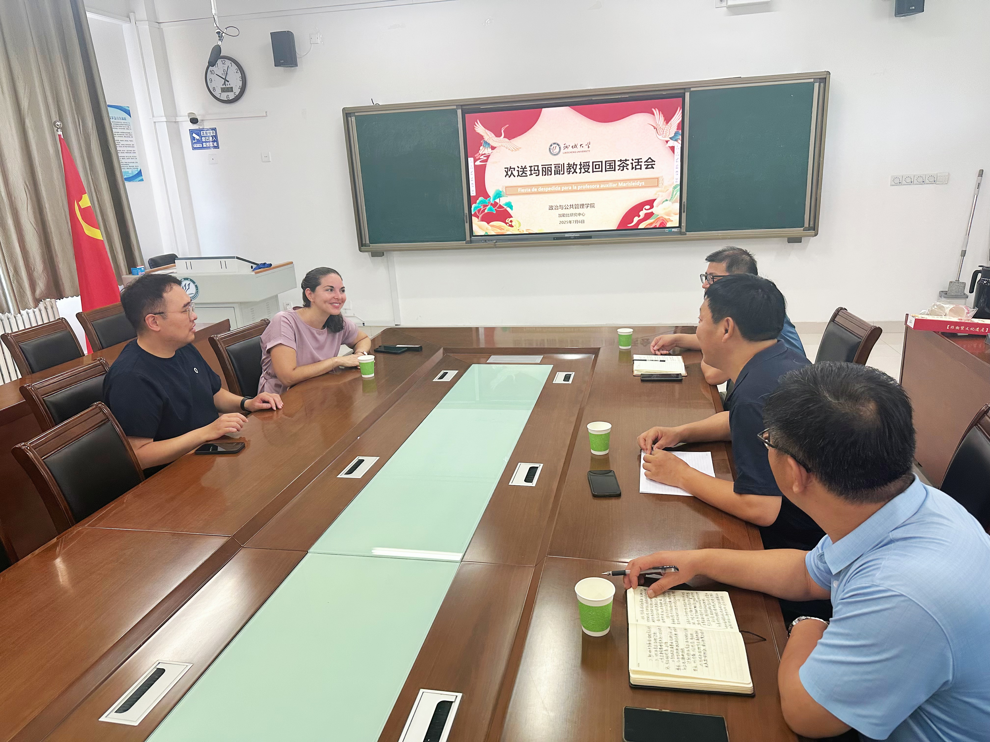在接下来的交流环节中,于学强从四个方面总结了玛丽在校九个月的贡献:一是强化了555电影 的教学团队,师资队伍的国际化更为凸显;二是提升了加勒比研究中心的学术力量,形成外籍专家+本国专家+研究生队伍的新格局;三是丰富了555电影 研究生课堂内容,开展了10次有关拉美的专题讲座;四是深化了中古、聊大-哈瓦那大学的合作,助力我校哈瓦那学院建设。玛丽副教授表示,九个月时间使她深入了解了中国文化,充满了对这个国家人民的热爱;她感谢在华期间学校和学院对她的帮助,愿意继续保持与中心的联系,也邀请大家访问她们的国家和学校。