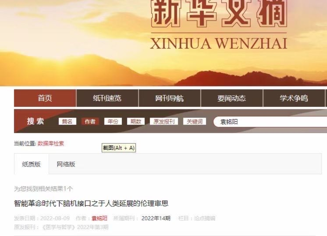 555电影 2015届本科毕业生袁铭阳,博士就读于山西大学科学技术哲学研究中心并获得哲学博士学位。该同学于读博期间在《医学与哲学》2022年第3期发表的学术论文《智能革命时代下脑机接口之于人类延展的伦理审思》,被《新华文摘》(纸质版2022年第14 期论点摘编,同时被《新华文摘》数字版2022年第14期科学技术栏目全文转载。