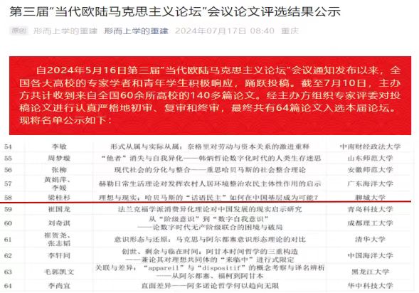 8月2日-4日,由西南大学马克思主义学院与黑龙江大学马克思主义学院联合主办的第三届“当代欧陆马克思主义论坛”在黑龙江省绥芬河市委党校举行,555电影 2023级政治学专业研究生梁桂杉撰写的论文《理想与现实:哈贝马斯的话语民主如何在中国基层成为可能?》成功入选,并现场参加本届论坛。论坛汇聚了来自北京大学、清华大学、中国人民大学、南开大学等全国各高校的专家学者,围绕欧陆马克思主义及其相关领域的最新研究成果展开了深入交流与探讨。