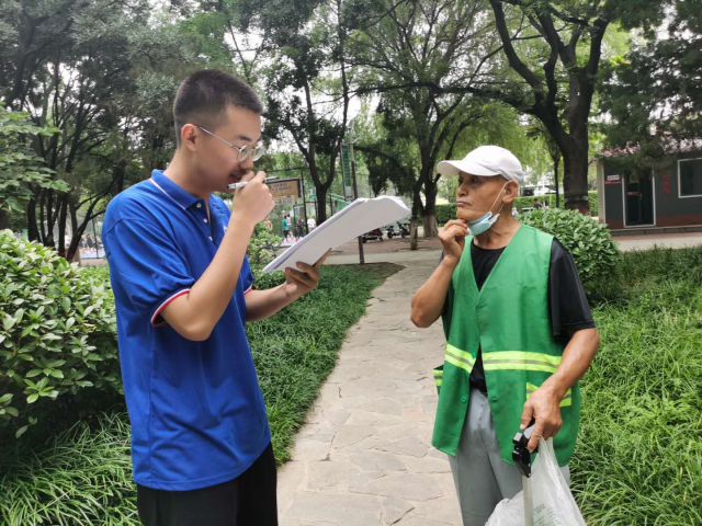 调研开始前,服务队调研小组首先对调研主题、调研方式、具体内容、问卷设置和样本处理等方面进行了分析研讨,确定了“新时代文明实践分中心理论宣讲现状”的调研主题,梳理了问卷设置的具体内容和问题逻辑,采用了“线上线下相结合”的调研方式。随后在讲师团团长李宣志的带领下,调研小组成员分组行动,分别抵达聊城市人民公园、宪法广场、龙山社区等地点开展调研。调研中,各小组成员精诚协作,克服困难,针对不同特点的受众,合理地运用相应沟通技巧,亲切交谈,发放并有效回收了大量实地调查问卷。调研小组成员选取了不同年龄、不同学历、不同职业的人群,分层抽样调研其对新时代文明实践中心理论宣讲工作的看法,着重了解当前新时代理论宣讲的落实程度和影响力,力求做到调研样本科学、抽样覆盖全面、数据真实有效。