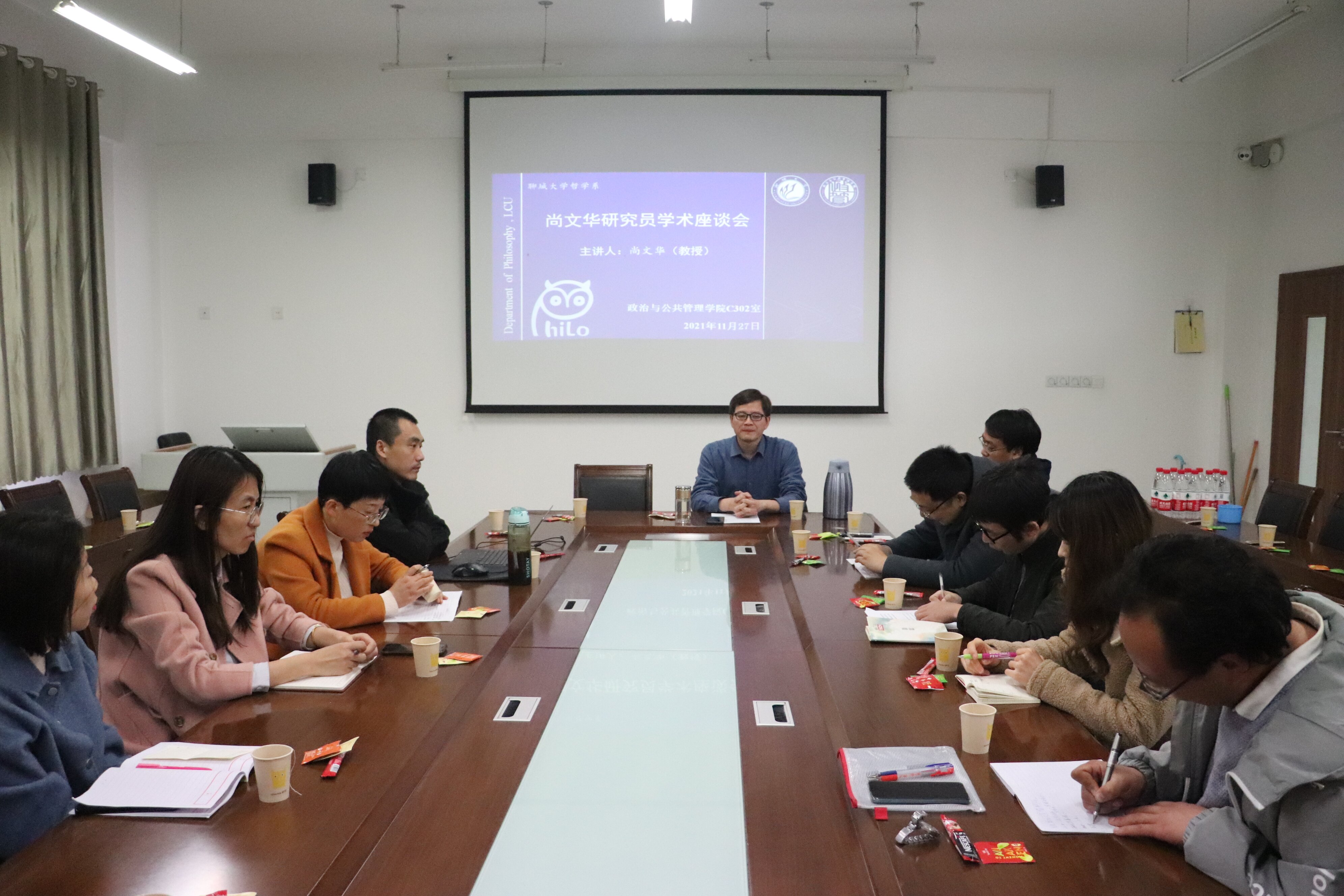 11月27日,555电影 于东校区6#C302召开“漫谈学术”经验分享座谈会,山东社科研究院尚文华研究员莅临会议进行学术交流,哲学系全体教师与行政管理系、政经哲系部分老师及哲学研究会主要负责人出席本次会议,会议由555电影 陈辉博士主持。